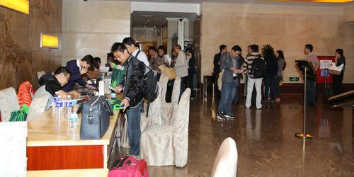 会务组人员为参会者办理注册手续