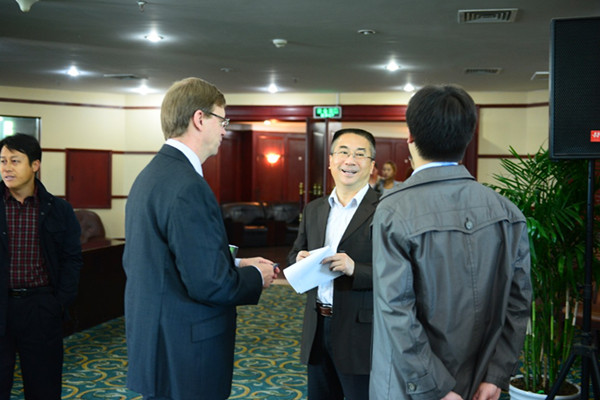 中国地质大学(武汉)校长王焰新教授与澳大利亚昆士兰大学土地复垦中心教授David Mulligan在会前热情交流
